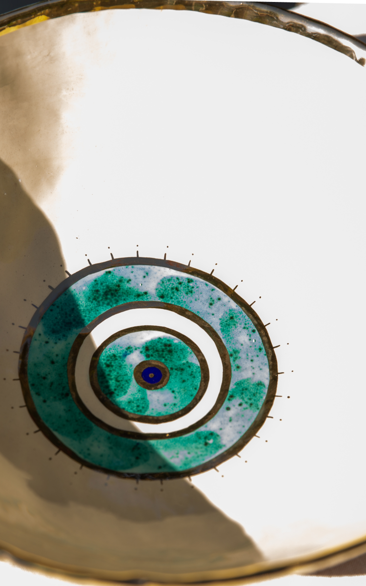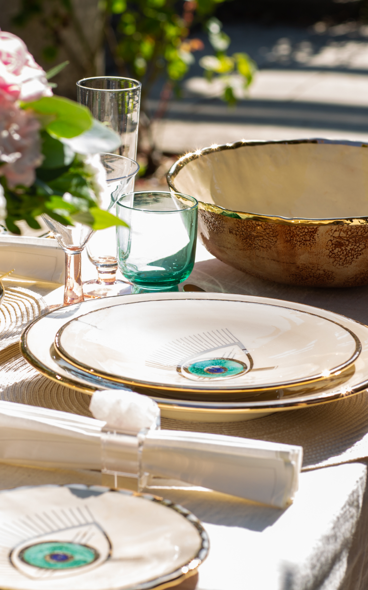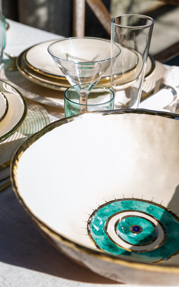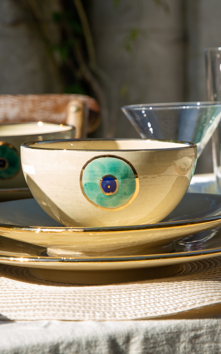 The combination of the evil eye and gold trim make this plate a truly unique and special addition to any dining set. Whether displayed on a shelf or used for serving food, this plate is sure to impress and add a touch of glamour to any setting.